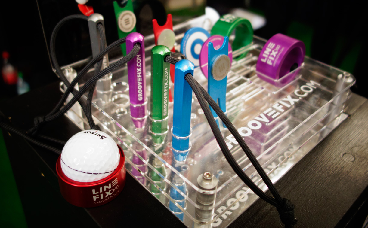 Wirklich schöne Accessoirs und Trainingshilfen stellt die Firma GrooveFix Premium Golf Accessories aus England her. Die aus Flugzeugaluminium hergestellten, wohl durchdachten Ballmarker, Groovenachzieher, Pitchgabeln und Trainingshilfen sind sehr gut designed, farblich toll gestaltet und haben eine lebenslange Garantie. Was soll an soliden Aluminiumteilen auch kaputt gehen? Der Golficionado legte sich auch gleich einen chicen Reduzierring (The Doughnut) zu, eine sicherlich sehr gute Trainingshilfe auch kurz vor der Runde. Die Löcher werden auf der Runde dann deutlich größer!