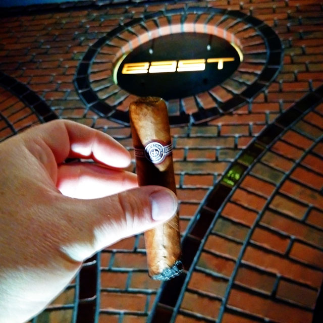 Das Hotel empfängt einen mit repräsentativer Auffahrt und direkt hinter dem Haupthaus liegendem Golfplatz. Die 27-Loch Anlage ist nicht zuletzt durch das hochsportliche Golf, das hier gespielt wurde und wird, bekannt. Zwischenzeitlich befand sich die Clubmannschaft Treudelbergs in der Bundesliga und das, obwohl der Verein beim Aufstieg „erst“ zehn Jahre alt war. Die Anlage ist sportlich durchaus anspruchsvoll, da oft lang zu spielen, der Pflegezustand war über Pfingsten gut. Die Kurse A und B sind nahezu im gleichen Stile erbaut und bieten strategisch gut plazierte Bunker, manchmal auch durch Rough oder Baum- bzw. Strauchbestand eingeengte Drivezonen, wobei es niemals unfair wird und wer sein langes Spiel beherrscht, kommt hier gut zurecht. Die Fairways sind weich geschwungen und die Grüns groß und mit einigen tricky breaks versehen, so daß hier präzises Anspiel schon hilft. Wenn man A+B spielt wird es zwischenzeitlich etwas monoton aber nicht langweilig. Das Sahnestück ist aber der C Kurs. Hier wird man von deutlich herausfordernder Architektur und Bodenbewegung begrüßt und es erfordert deutlich mehr Strategie im Spiel als bei den anderen beiden neun Loch Kursen. Toll ist das Inselgrün C5 und vor allem sind die jeweiligen Abschlussgrüns an der Club/Hotelterrasse ein präzises Anspiel fordernd, da halb bzw. volle Inselgrüns. Den Abschluß fanden wir auf der Terrasse vor den Inselgrüns mit leckerem Essen, kaltem Getränk und begleitet von einer wohlschmeckenden Casa de Torres Toro. Dieser nicaraguanische Longfiller, TAM mit connecticutshade Deckblatt aus Ecuador ist eine leckere Zigarre mit cremigem Rauch und rundem, eher mildem Geschmack nach Nuss und Frucht. Eine gute Empfehlung, wenn man die Zeit für eine Toro hat und unangestrengt rauchen möchte!